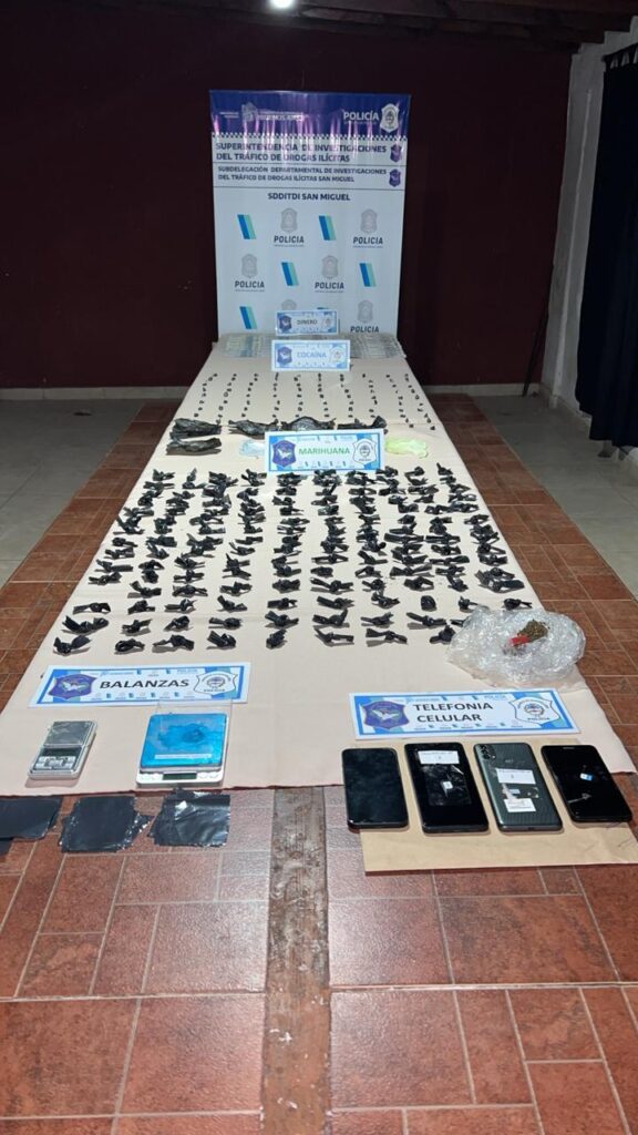 Durante los allanamientos, los efectivos secuestraron una cantidad significativa de clorhidrato de cocaína y marihuana, ya fraccionadas y listas para su comercialización. También se incautó dinero en efectivo, varios teléfonos celulares y dos balanzas utilizadas presuntamente para el pesaje de la droga.