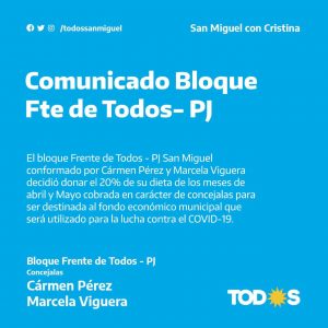 La confirmación viene del bloque “Frente de Todos”, que conforman las Concejales Cármen Pérez y Marcela Viguera, ambas decidieron donar el veinte por ciento, (20%), de su dieta como Edil, correspondiente a los meses de Abril y Mayo, para que tengan como destino el fondo económico Municipal que será destinada a la utilización para la lucha contra COVID-19.