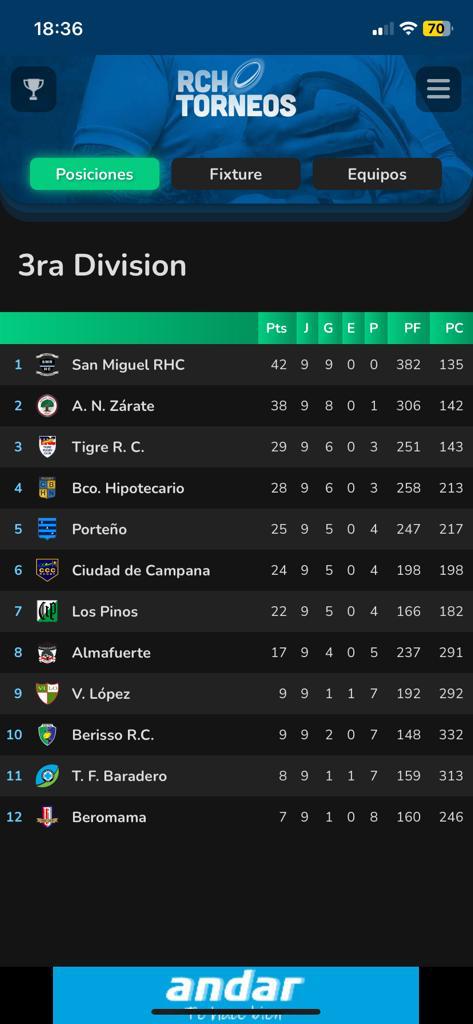 San Miguel Rugby venció en condición de visitante a Banco Hipotecario por 31 a 18 con punto bonus y conserva la punta del torneo de Tercera.
