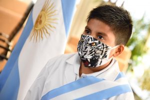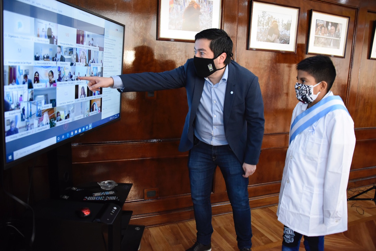 Anteriormente, en horas de la mañana, el jefe comunal acompañó a Ezequiel, estudiante de 4to B de la Escuela Primaria N° 16 de Tierras Altas, quién fue seleccionado por el Gobierno de la Provincia de Buenos Aires para representar a Malvinas Argentinas y participar del acto formal realizado por el gobernador Axel Kicillof, la vicegobernadora Verónica Magario y la directora general de Escuelas, Agustina Vila, junto a los 135 municipios de la Provincia. En este encuentro, Ezequiel fue uno de los 10 elegidos para dialogar con el gobernador durante la transmisión virtual. En ese momento, el niño dijo prometer a la bandera: “Mi orgullo y mi felicidad”.