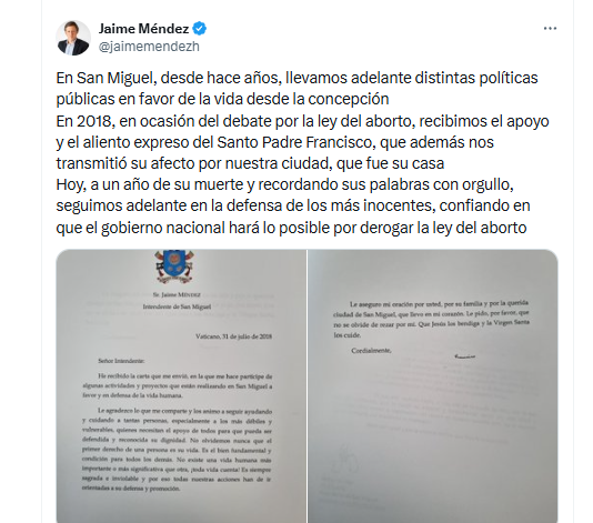 En San Miguel, desde hace años, llevamos adelante distintas políticas públicas en favor de la vida desde la concepción En 2018, en ocasión del debate por la ley del aborto, recibimos el apoyo y el aliento expreso del Santo Padre Francisco, que además nos transmitió su afecto por nuestra ciudad, que fue su casa Hoy, a un año de su muerte y recordando sus palabras con orgullo, seguimos adelante en la defensa de los más inocentes, confiando en que el gobierno nacional hará lo posible por derogar la ley del aborto.