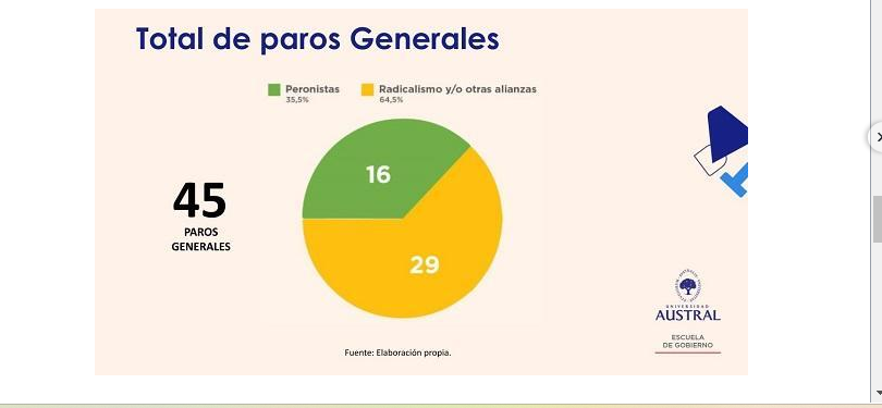 En esa línea, el estudio examina el promedio de paros por gestión. Los gobiernos no peronistas (cuatro mandatos con uno en desarrollo) soportan un promedio de 7,25 paros por gestión, en comparación con los 2,29 paros por gestión para los gobiernos peronistas (siete mandatos). En cuanto a la cantidad de paros por año de gobierno el informe especifica que los gobiernos no peronistas experimentaron un promedio de 2,23 paros por año (durante 13 años), mientras que los gobiernos peronistas registraron 0,57 paros por año (durante 28 años). Esto significa que, en promedio, el sindicalismo realizó un paro cada dos años a presidentes peronistas, y más de cuatro paros cada dos años a presidentes de signo opuesto.